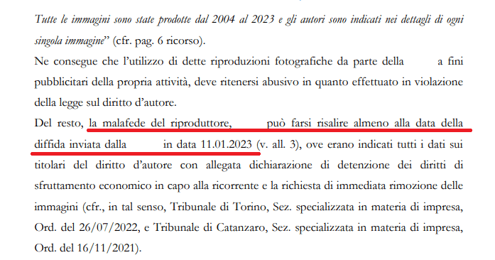 Questa sentenza in pratica ci dice che ignorare gli avvisi di copyright (quanto meno quelli che arrivano tramite raccomnandata o Pec) e non rimuovere nemmeno la foto, significa passare dalla parte del torto e fornire prova di malafede, quanto meno a partire dalla data in cui si è venuto a conoscenza della protezione delle foto.